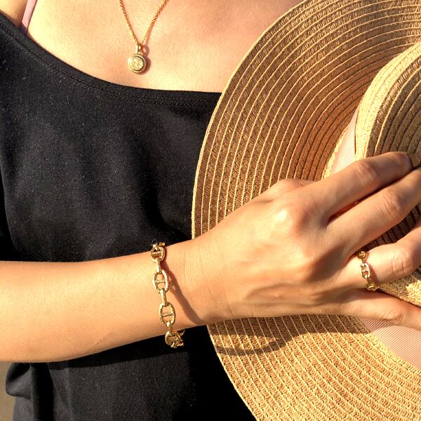 船の碇をつなぐ鎖のように、全体にマリンが施されたバングル。