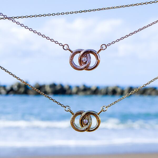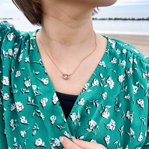 クロスしたサークルの中心にキュービックジルコニアを一石、個性派ネックレス!