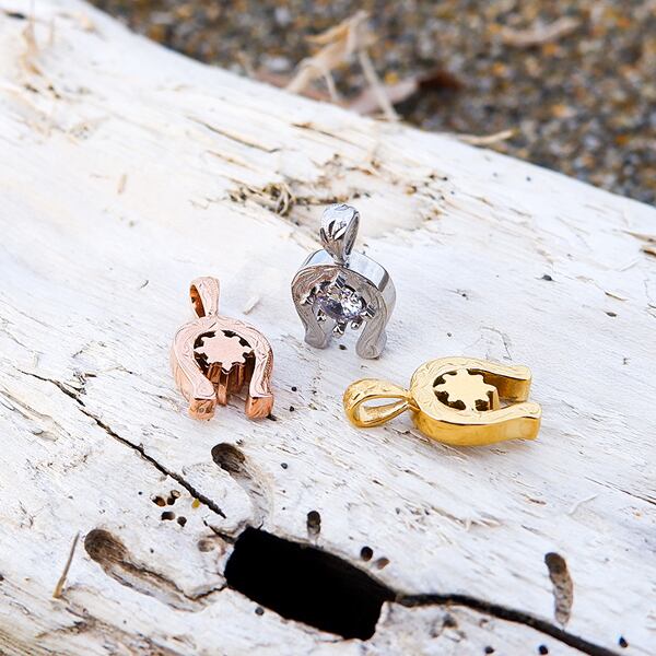 幸運を招く馬蹄のデザインのど真ん中に6本の爪に支えられたジルコニア